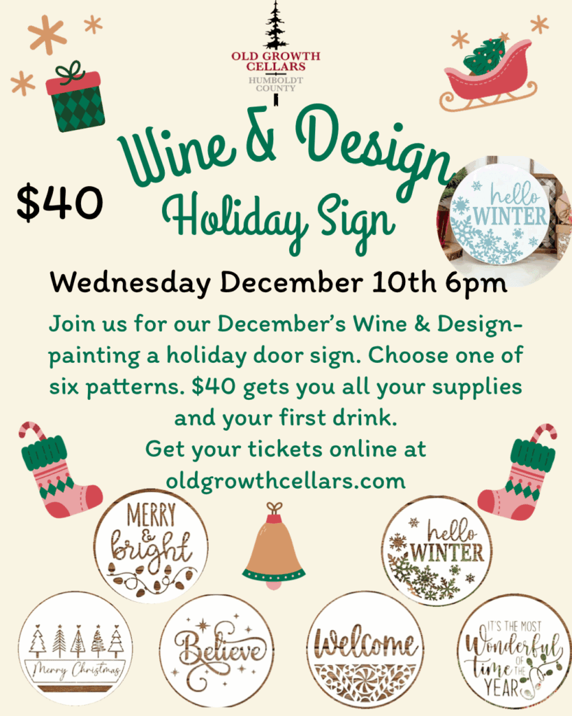Join us for our December’s Wine & Design-Holiday Signs. Choose one of six designs and paint your own sign. $40 gets you all your supplies and your first drink! Please be sure to pick your design when purchasing your ticket!